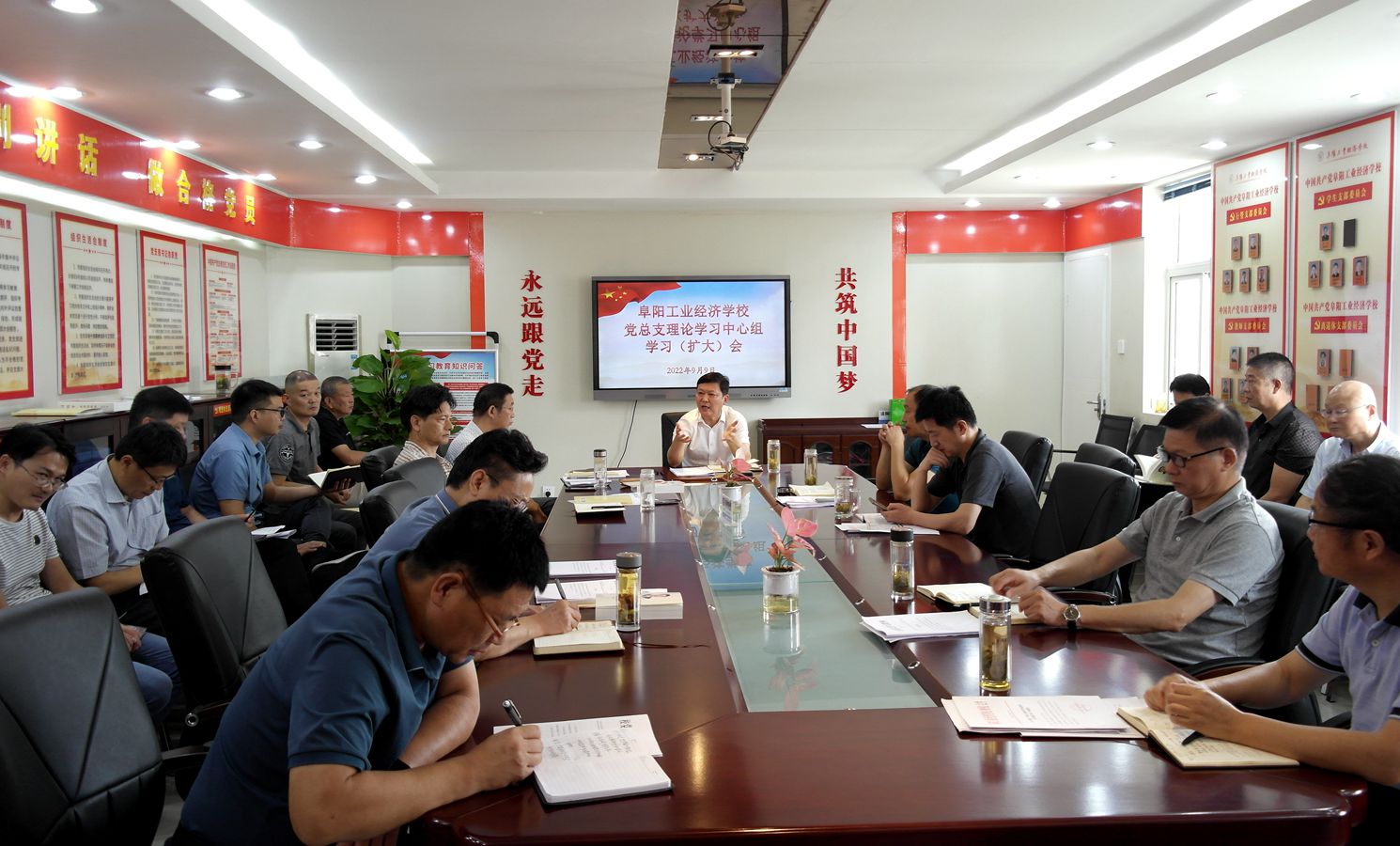 会上重温学习了习近平总书记考察安徽及阜阳重要讲话指示精神,共同学习了《习近平谈治国理政》第四卷以及《习近平经济思想学习纲要》部分章节,传达学习了李克强在国务院常务会议上的讲话精神和2022年中秋国庆节点纠四风树新风工作提示,学习了意识形态有关密件和职业教育工作这么干相关文件精神。