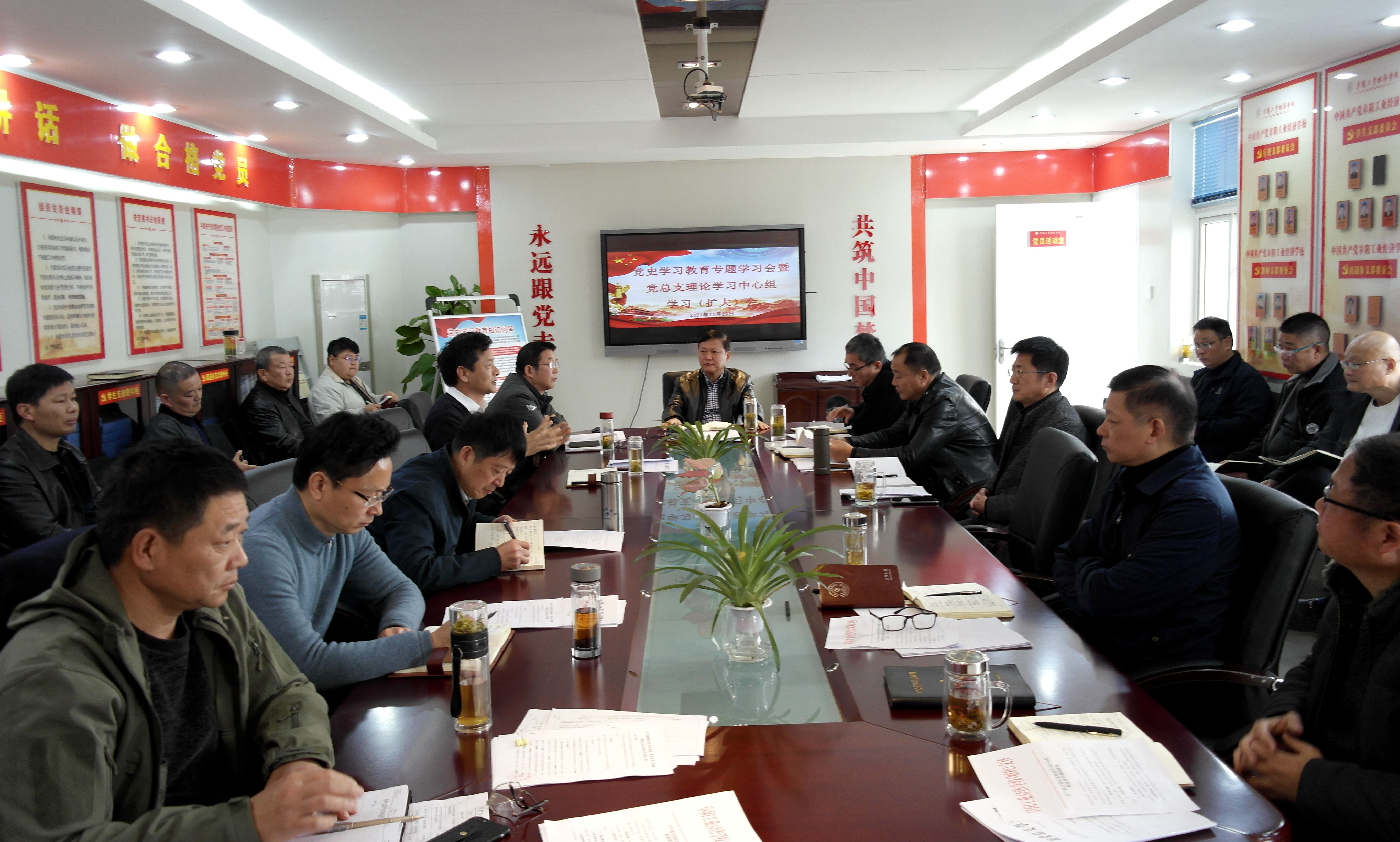 11月29日,阜阳工业经济学校召开党史学习教育暨党总支理论学习中心组学习(扩大)会传达党的十九届六中全会精神。校班子成员、各科室负责人参加会议。会议由校党委书记、校长周波主持。
