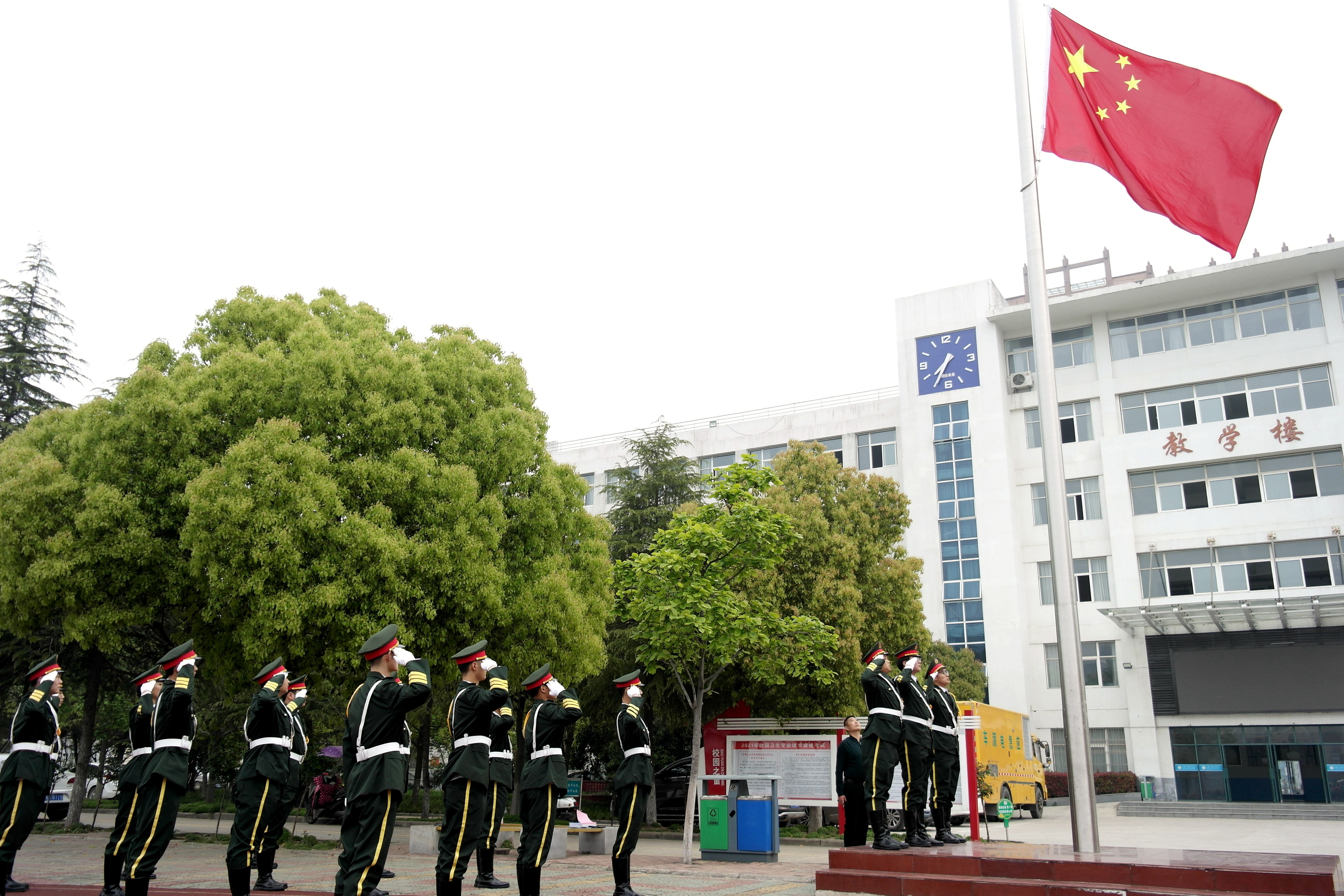 4月12日上午,在阜阳工业经济学校南校区和东校区国旗台前操场,学校国旗护卫队护旗手迎着四月的朝阳,以挺拔的身姿,整齐的步伐,坚毅的眼神,护送国旗上升旗台。伴随着雄壮的国歌,鲜艳的五星红旗冉冉升起。全校师生面向国旗立正肃立,向国旗行注目礼,拉开了两校区“青少年学党史”活动的序幕。