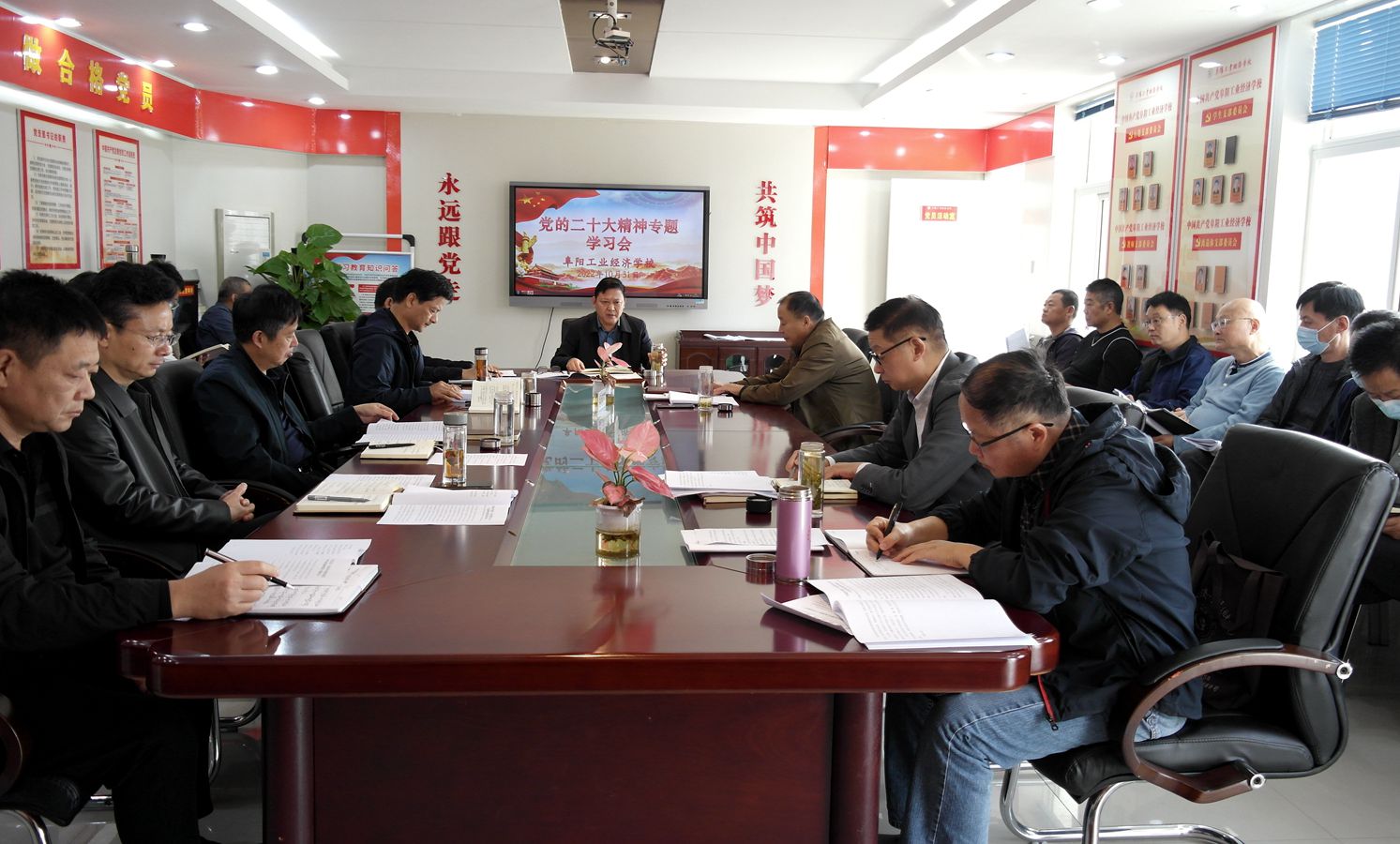 10月31日,阜阳工业经济学校召开2022年第十二次党总支理论学习中心组学习(扩大)会暨党的二十大精神专题学习会。会议由校党委书记、校长周波主持。校班子成员、各科室负责人参加会议。