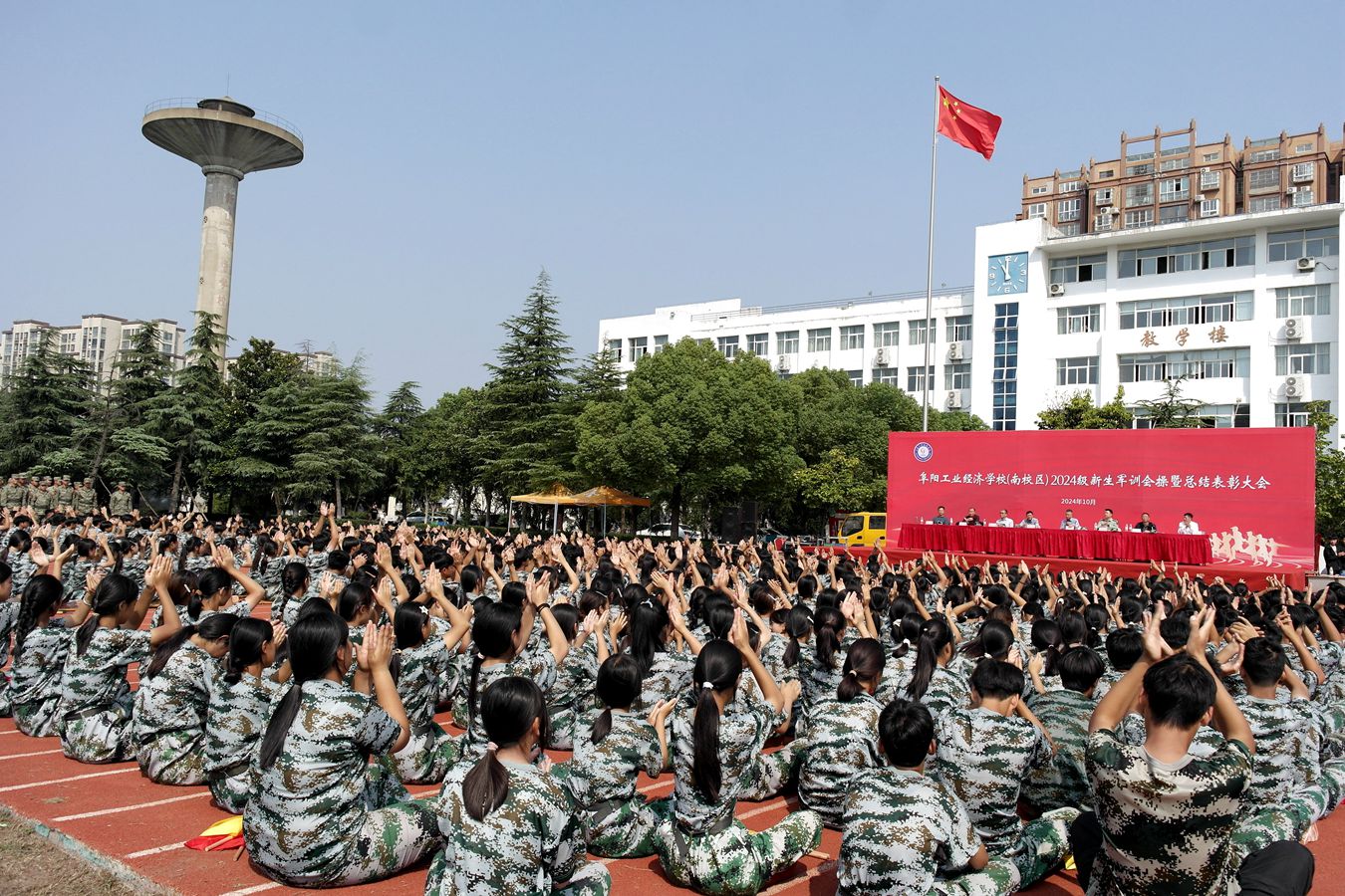 10月9日,阜阳工业经济学校2024级新生军训会操暨总结表彰大会在两校区田径场举行。校党委书记周波,副书记、校长孙杰,颍州区人武部教官、部分班子成员、2024级班主任及全体新生参加了大会。大会由党委委员、副校长孙道远主持。