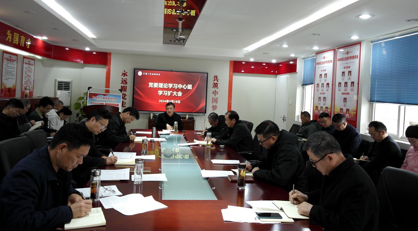 3月18日,阜阳工业经济学校召开2024年第五次党委理论学习中心组学习扩大会。校党委委员、各科室负责人参加会议,会议由校党委书记、校长周波主持。