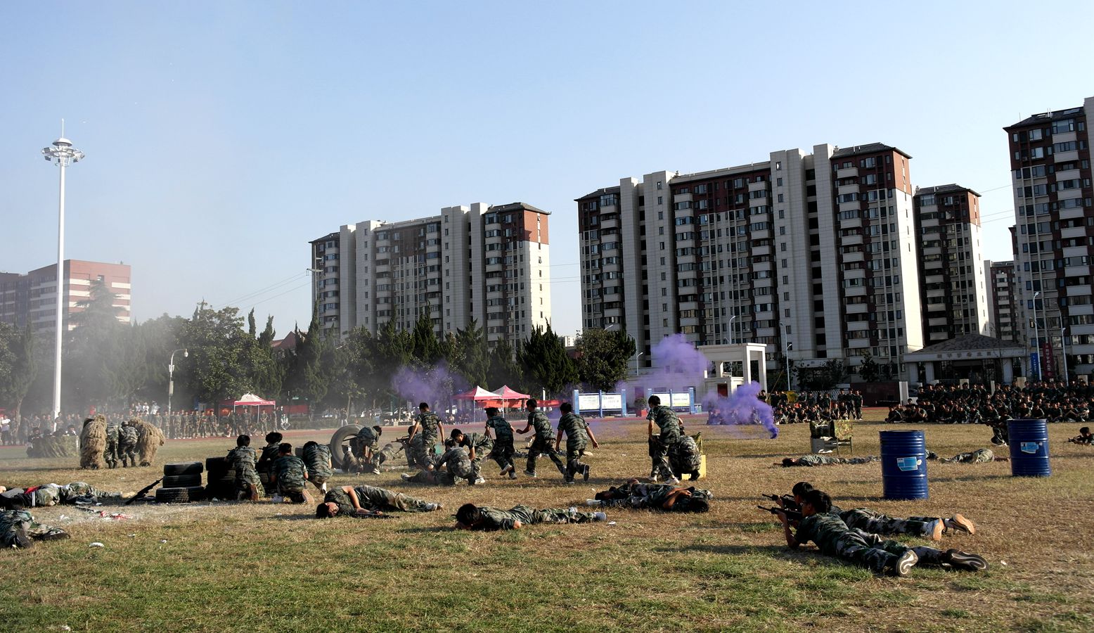 今年的新生军训表演,和往年不同。当方队的新生们在操场后方集结完毕之后,多名身着迷彩作战服、手持步枪的“特种兵”矫捷入场,侧扑、前扑、前滚翻、匍匐前进、模拟射击,进行一场模拟反恐作战……师生喝彩阵阵。希望通过这些军训项目的增加,锻炼同学们的拼搏精神、组织纪律观念,加强军事及身体素质。