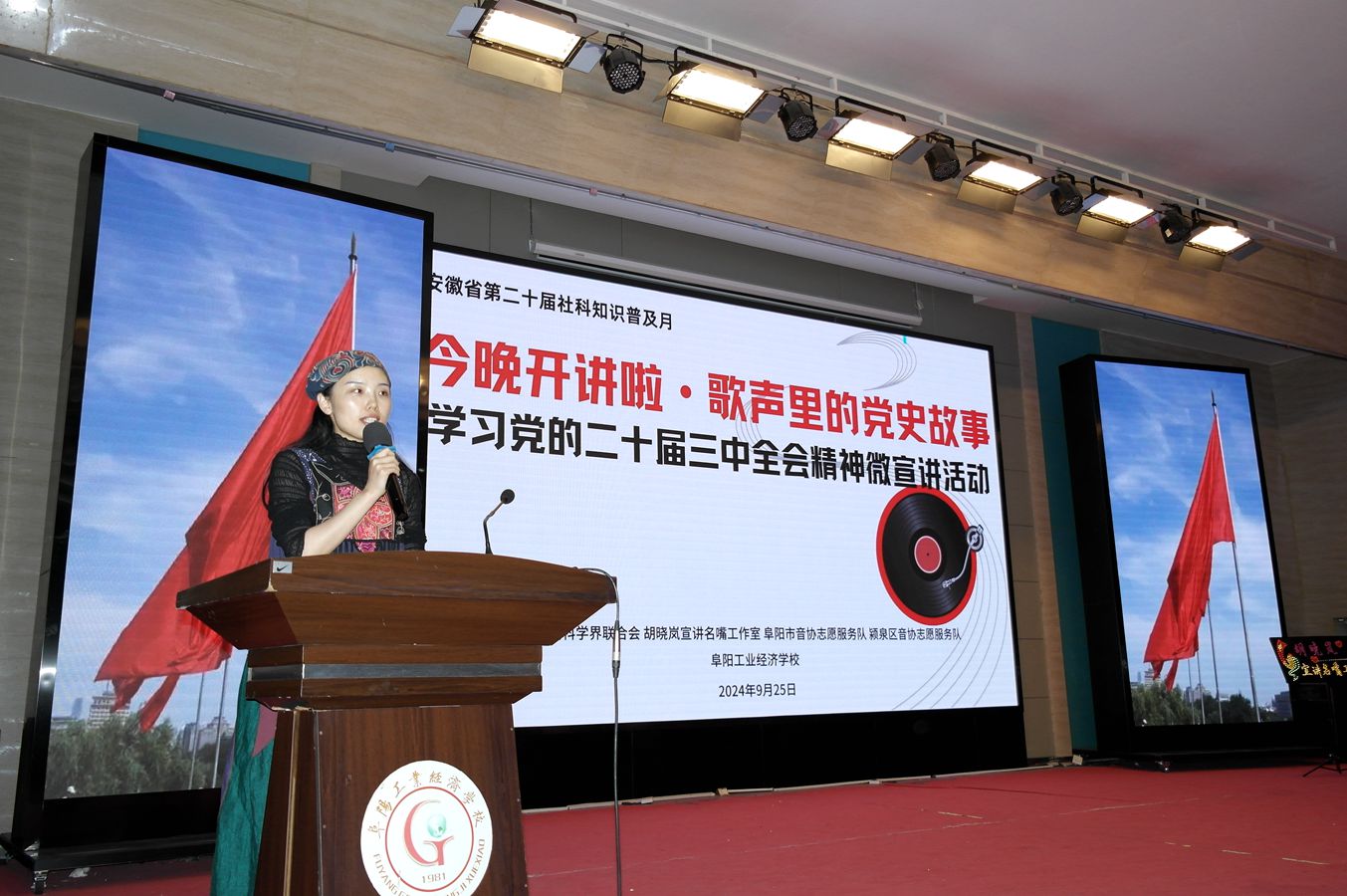 9月25日晚,由阜阳市社科联、胡晓岚宣讲名嘴工作室、阜阳市音协志愿服务队和颍泉区音协志愿服务队主办的“今晚开讲啦·歌声里的党史故事”暨学习党的二十届三中全会精神微宣讲党史篇在阜阳工业经济学校隆重举行,为在场师生带来了一次震撼心灵的红色之旅。