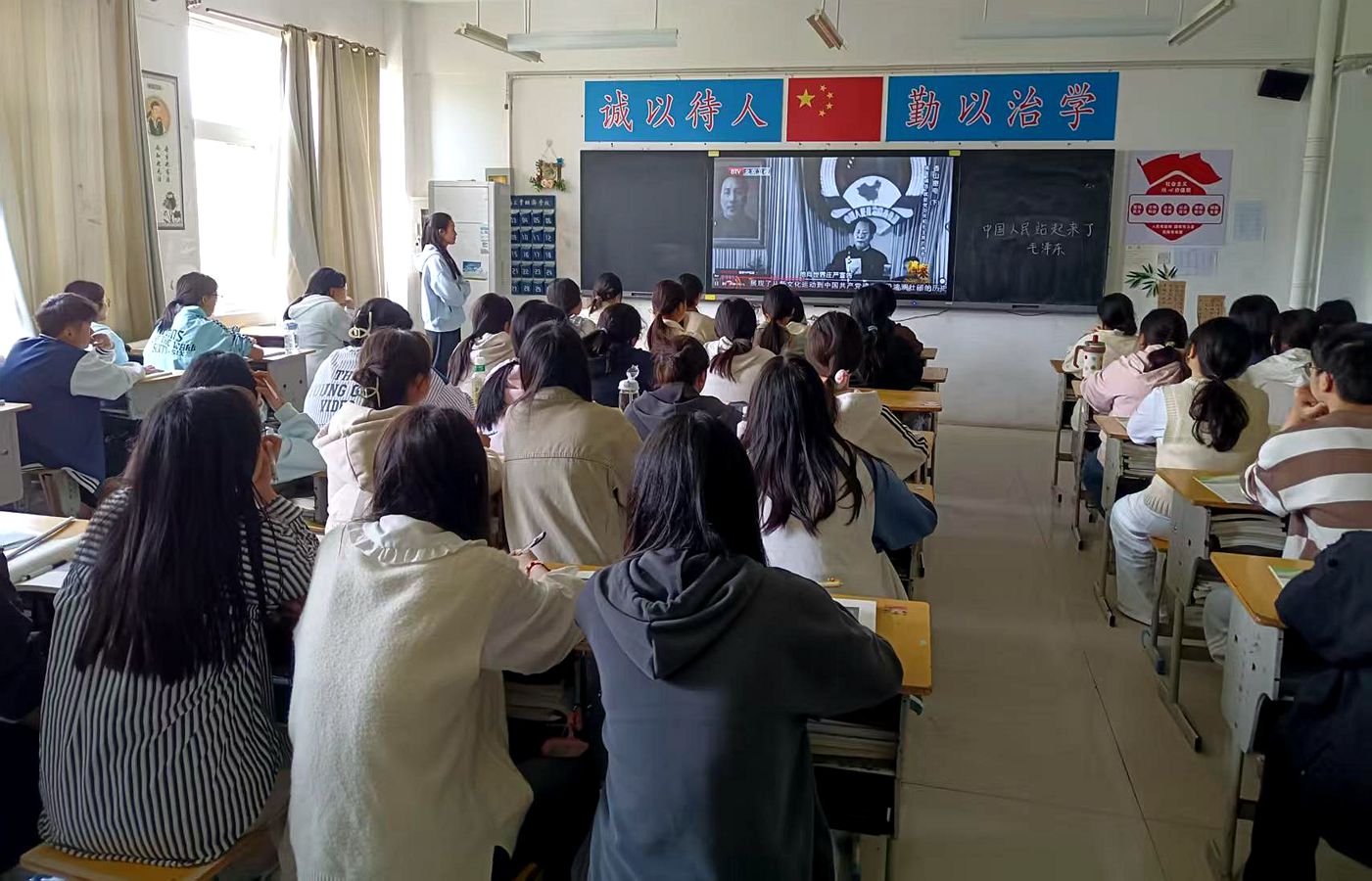 4月8日上午第3节课,李雪源老师在2024级计算机平面设计3班开展《中国人民站起来了》公开课示范教学。李老师通过影像资料,带领学生回顾了新中国成立的光辉历程,启发学生在梳理文章“回顾过去——立足当下——展望未来”内在逻辑结构的同时,感悟“中国人民站起来了”的深刻内涵,增强学生的民族自信心和时代使命感。