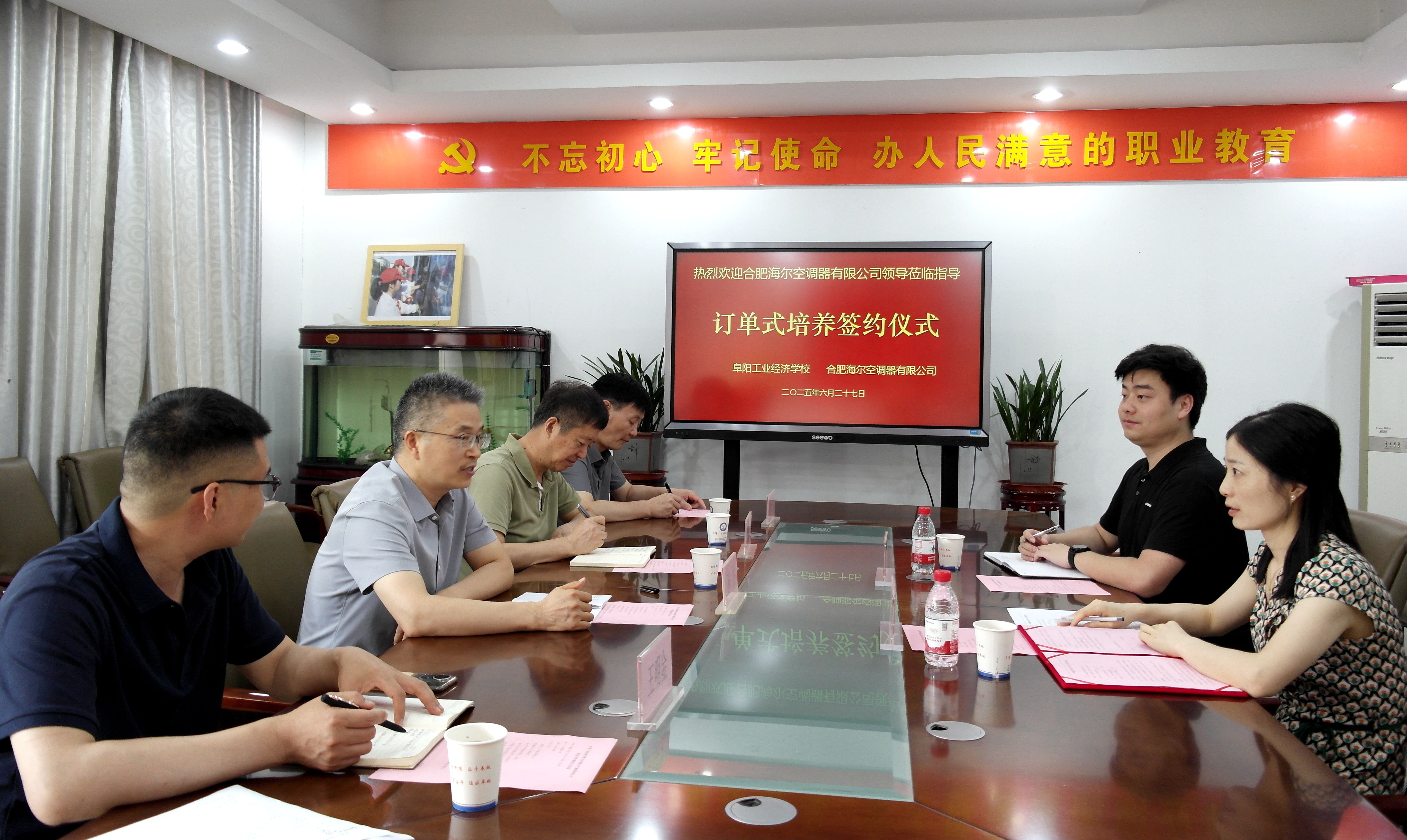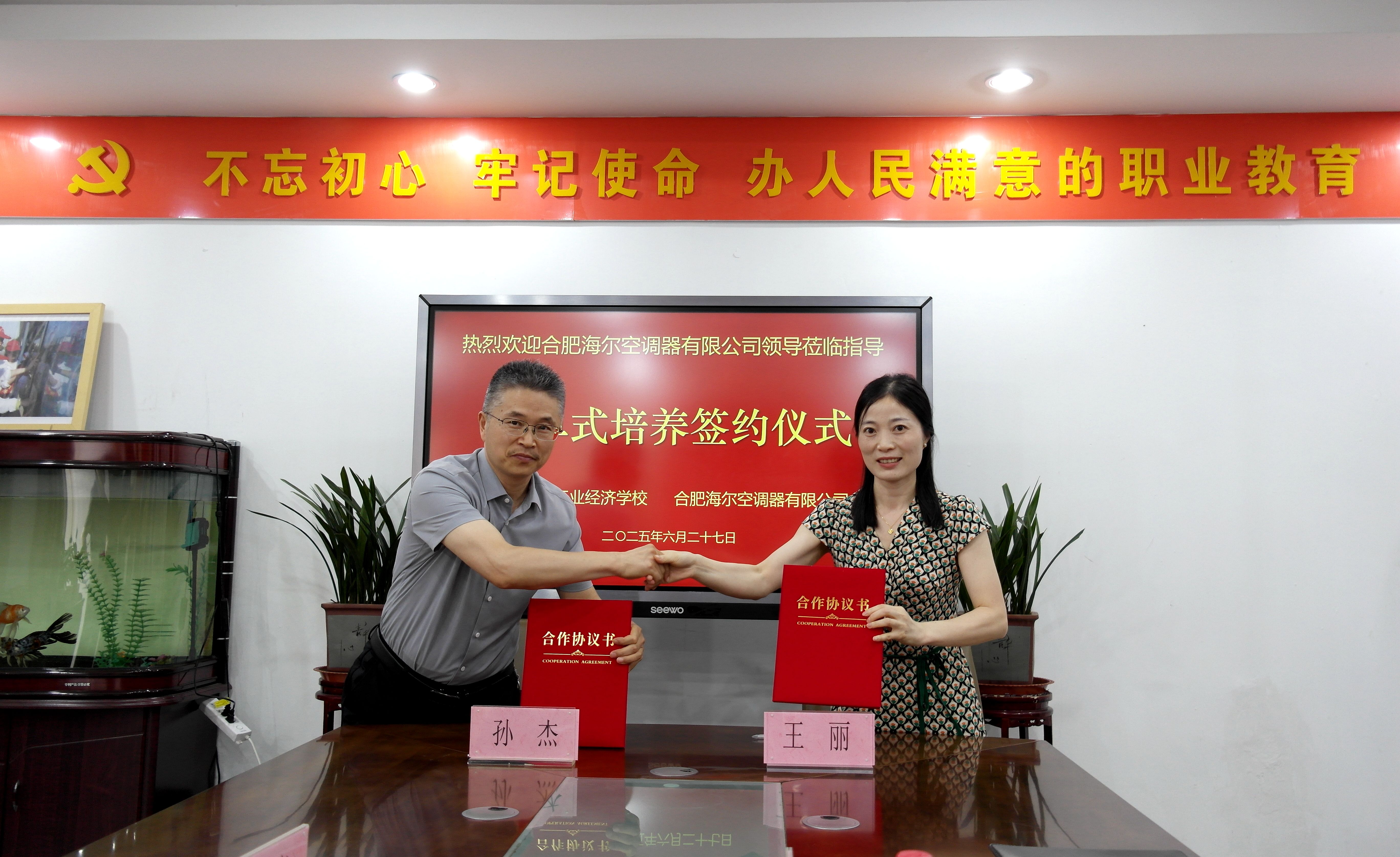 6月27日,合肥海尔空调器有限公司与阜阳工业经济学校订单式培养签约仪式在该校南校区举行。合肥海尔空调器有限公司人力资源部部长王丽等企业代表,与阜阳工业经济学校党委副书记、校长孙杰等共同见证协议签署,开启校企合作新征程。