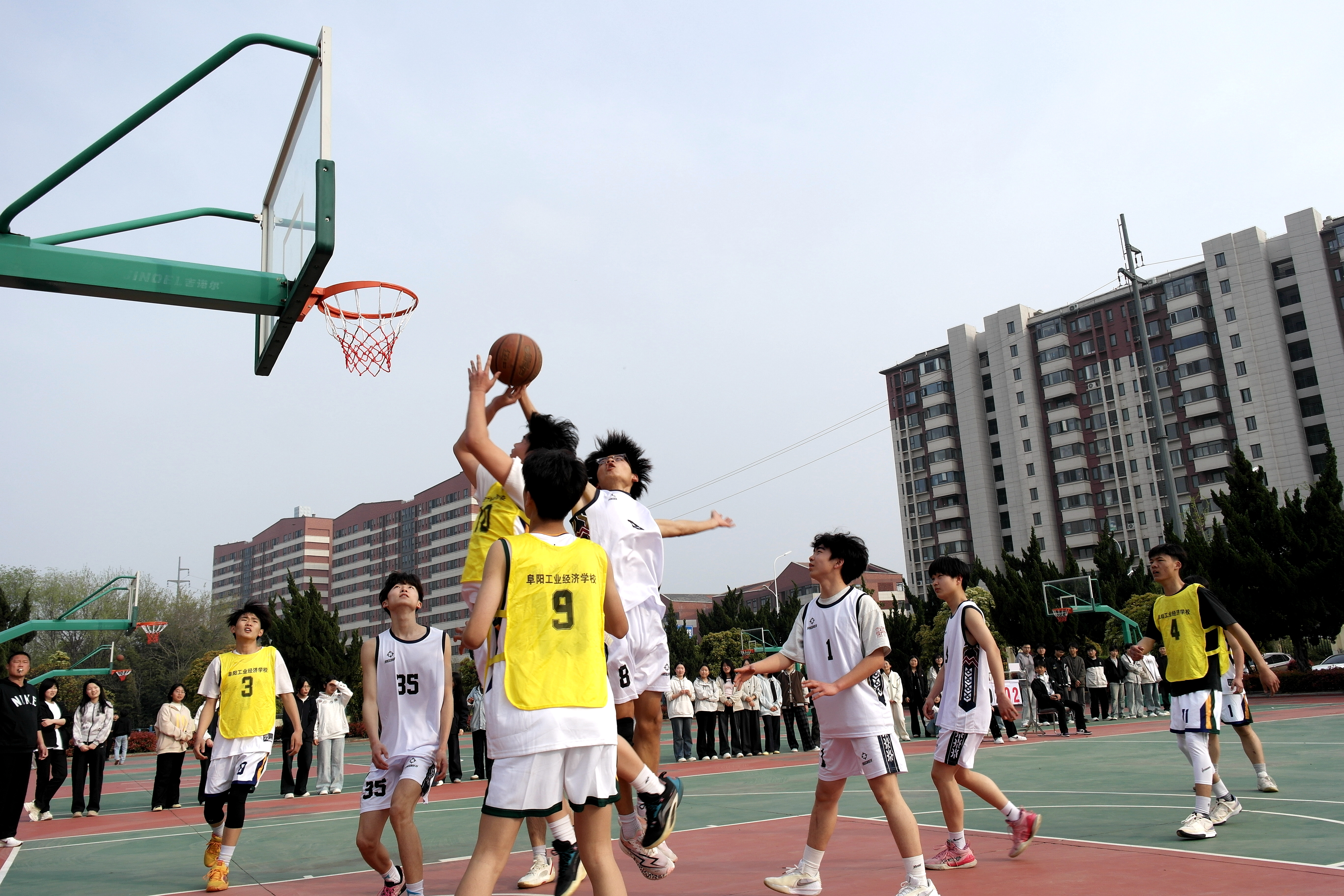 为深化校际体育交流,丰富校园文化生活,锤炼学子体育素养,3月31日,阜阳经贸旅游学校篮球队一行莅临我校,开展主题为“以球会友 情暖两校”的篮球交流赛。我校相关负责人、体育组教师,以及两校篮球队队员、部分学生代表参加活动,共同见证这场充满激情与温情的体育赛事。