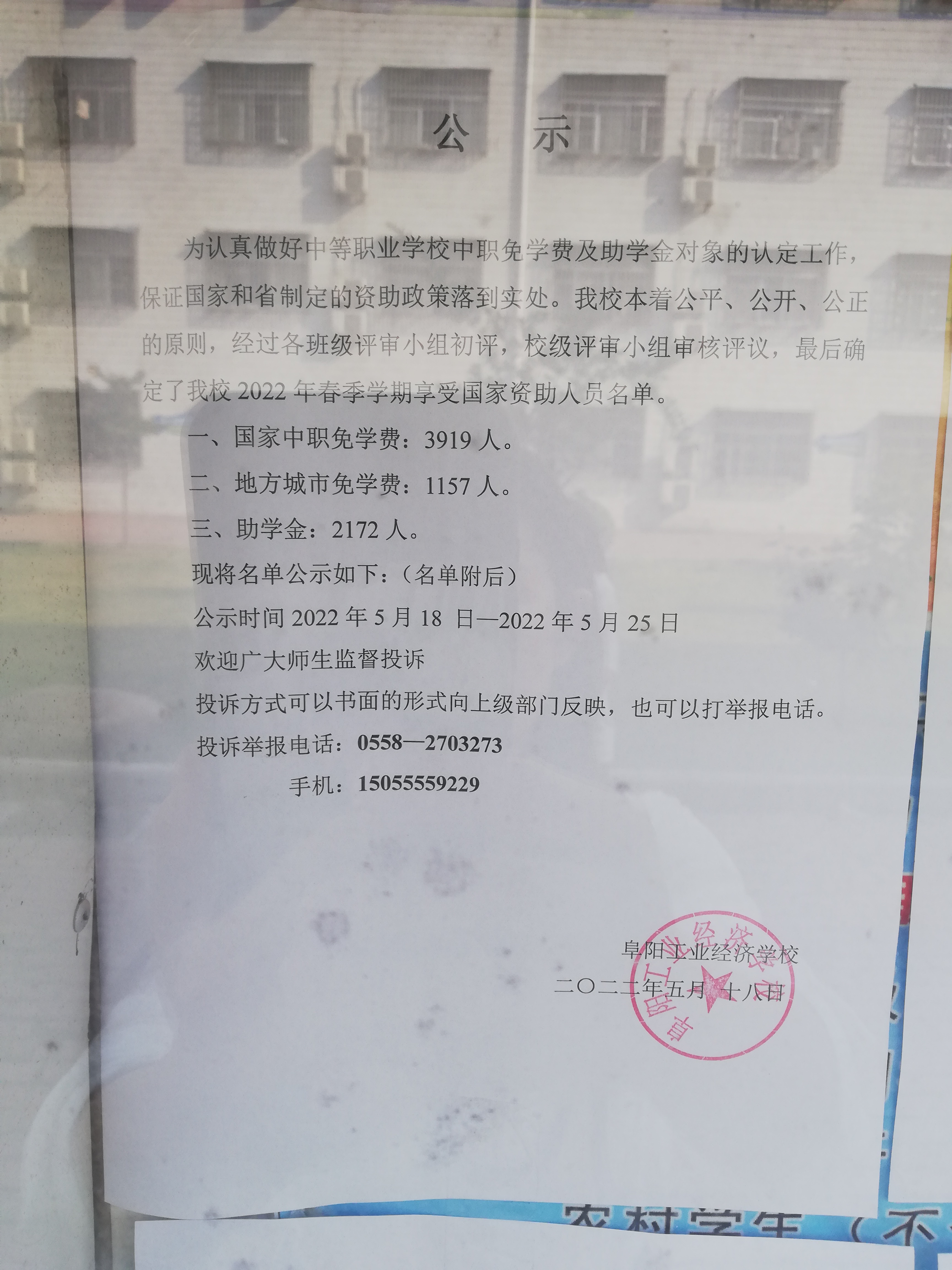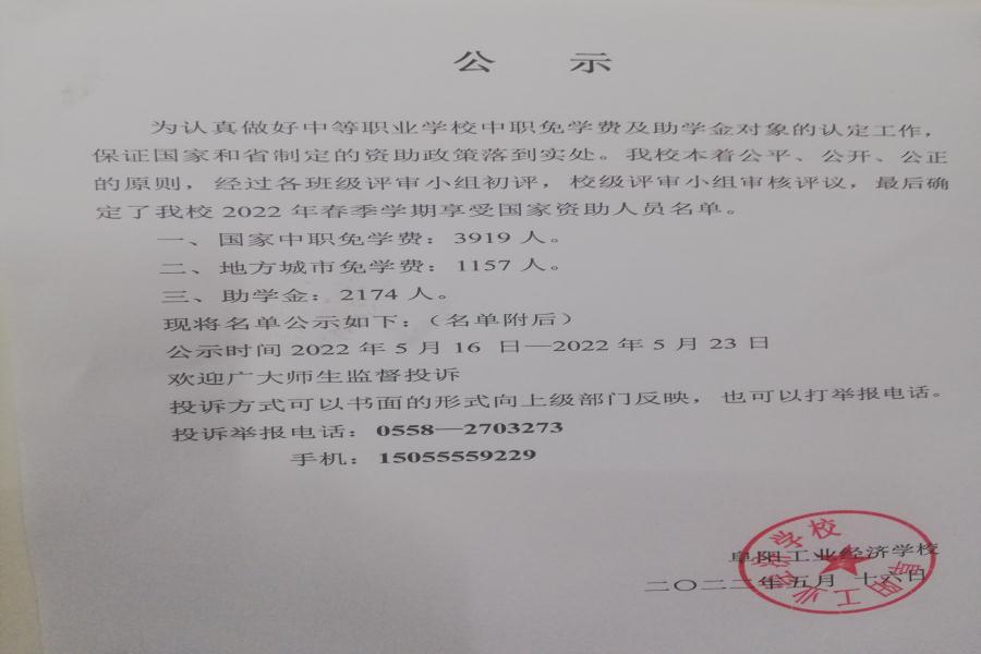 阜阳工业经济学校2022年春季学期国家资助学生名单公示