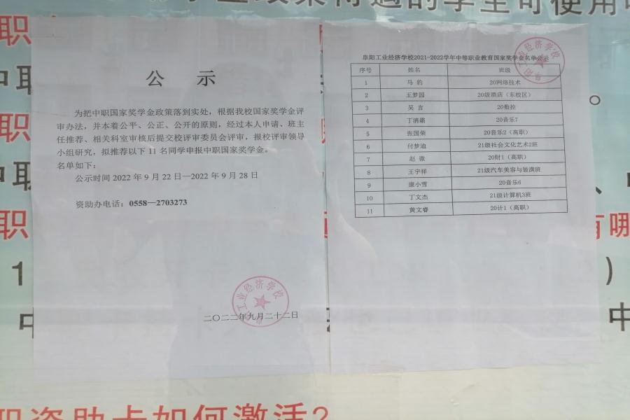 阜阳工业经济学校2021-2022学年中等职业教育国家奖学金名单公示