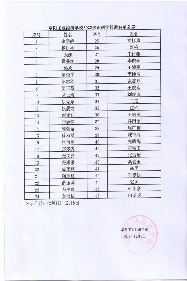 阜阳工业经济学校2022年创业补贴名单公示